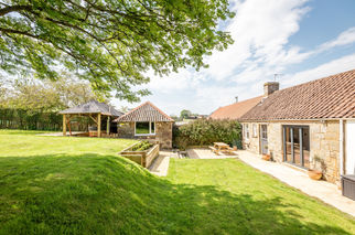 With captivating countryside views, the beautifully kept large rear garden features an expansive lawn with established trees bordered by a sandstone-paved alfresco dining area. A focal point is the wood-burning stove-fired hot tub nestled under a timber pergola.